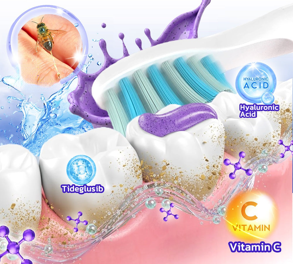 Hyaluronic acid: This molecule, an innovative fusion of hydration science, nourishes and regenerates gum tissue, accelerates oral healing and maintains optimal moisture levels for improved tissue regeneration and overall gum vitality.