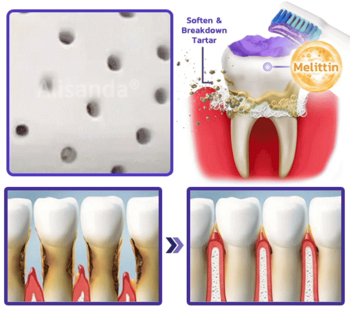 Alisanda® VioCore Dental Treatment Toothpaste has been specially developed not only to remove plaque, but also to dissolve stubborn tartar deposits. Its advanced formula softens and breaks down calcified tartar with the help of the antibacterial and enzymatic properties. Melittin, a powerful peptide found,weakens the bonds within tartar deposits, allowing them to be removed naturally during brushing. This process prevents further irritation and creates a smoother surface on the teeth, reducing the risk of plaque re-accumulation and promoting long-term oral health.
